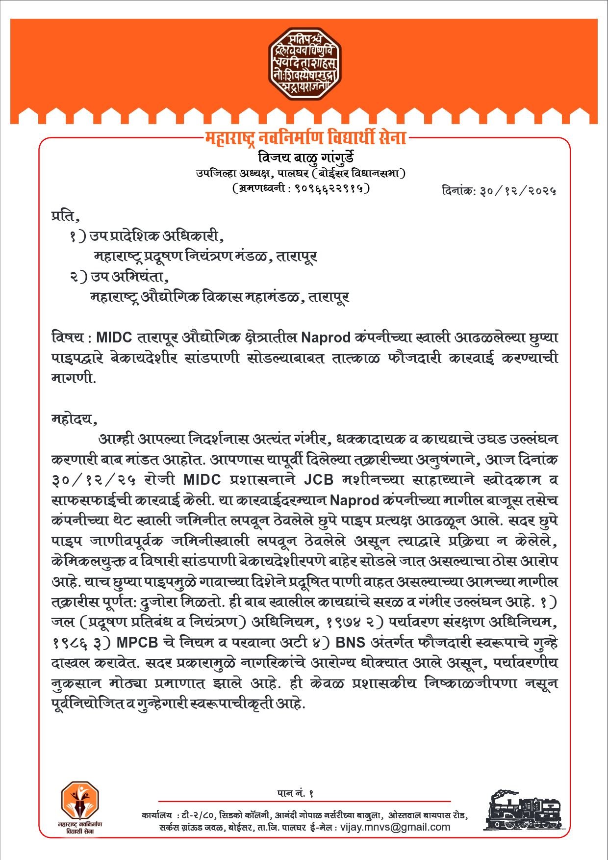 या संपूर्ण प्रकरणाची तक्रार विजय बाळू गांगुर्डे (उपजिल्हाध्यक्ष, पालघर) आणि धिरज गावड (जिल्हाध्यक्ष, महाराष्ट्र नवनिर्माण विद्यार्थी सेना) यांनी संबंधित यंत्रणांकडे केली आहे. त्यांच्या म्हणण्यानुसार, ही बाब केवळ निष्काळजीपणाची नसून पूर्वनियोजित, गुन्हेगारी हेतूने करण्यात आलेली कारवाई आहे. या प्रकारामुळे परिसरातील नागरिकांचे आरोग्य धोक्यात आले असून जमीन, भूजल, नदीप्रवाह आणि पर्यावरणावर गंभीर परिणाम झाला आहे.