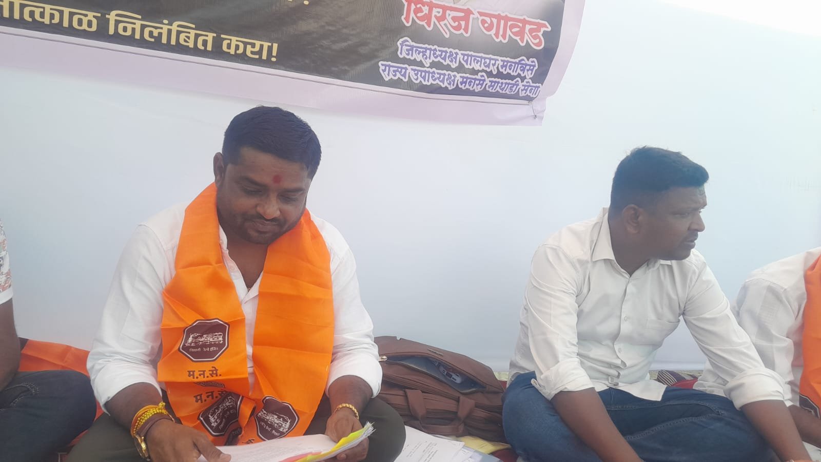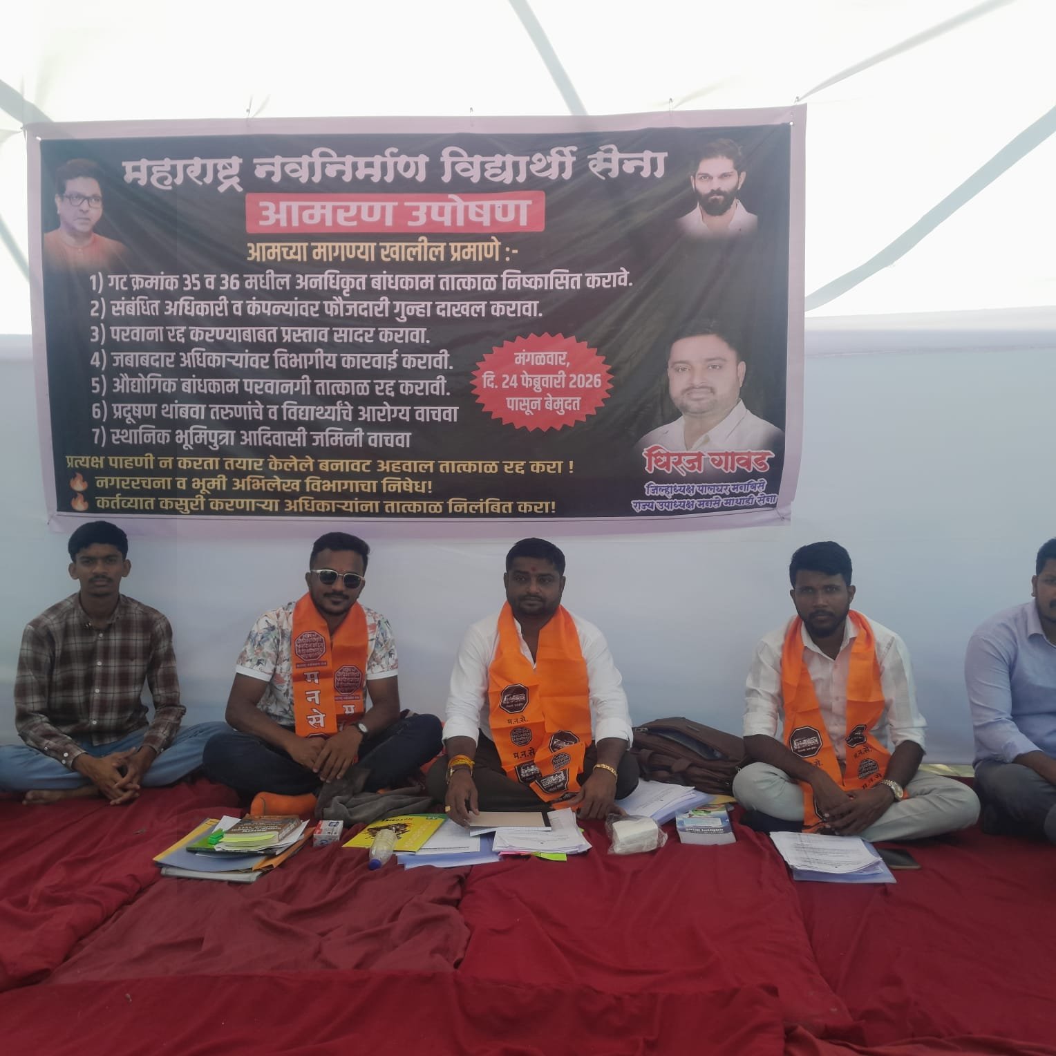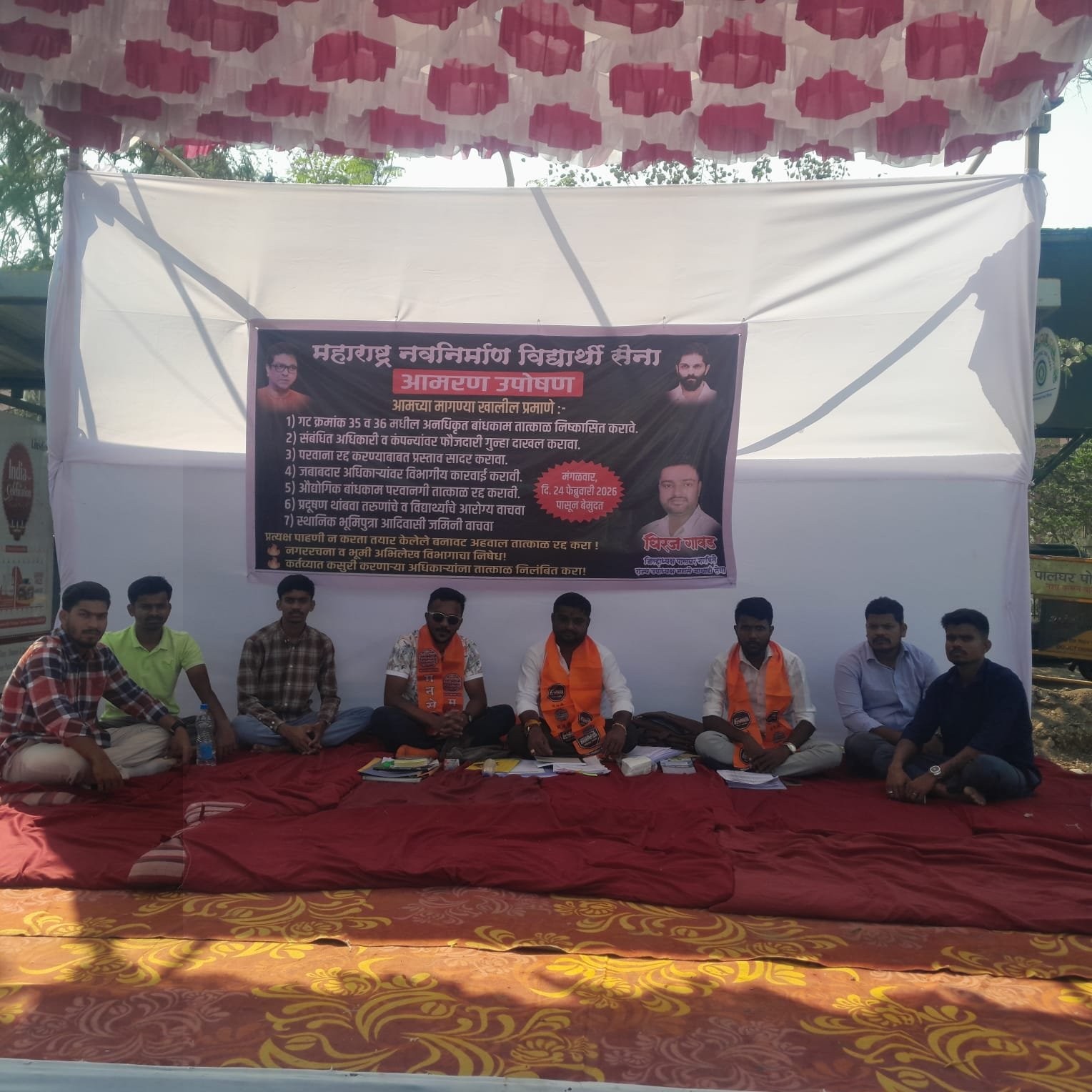 पाली येथिल गट क्रमांक 35 व 36 या आदिवासी जमिनीवर विनापरवानगी 1584 चौरस मीटर क्षेत्रफळाचे अनधिकृत बांधकाम झाल्याचा गंभीर आरोप करत महाराष्ट्र नवनिर्माण सेना आक्रमक झाली आहे.मनविसे जिल्हा अध्यक्ष धिरज गावड हे उपोषणाला बसले आहेत.त्यात एकाच ठिकाणी आदिवासी जागेवर तीन कंपन्या असल्याचा धक्कादायक प्रकार समोर आल्याचा दावा करत मनसेने आमरण उपोषण छेडले आहे.या प्रकरणी तात्काळ चौकशी करून संबंधित अधिकारी, वास्तुविशारद आणि कंपनी मालकांवर फौजदारी गुन्हे दाखल करण्यात यावेत, अशी ठाम मागणी आंदोलनकर्त्यांनी केली आहे