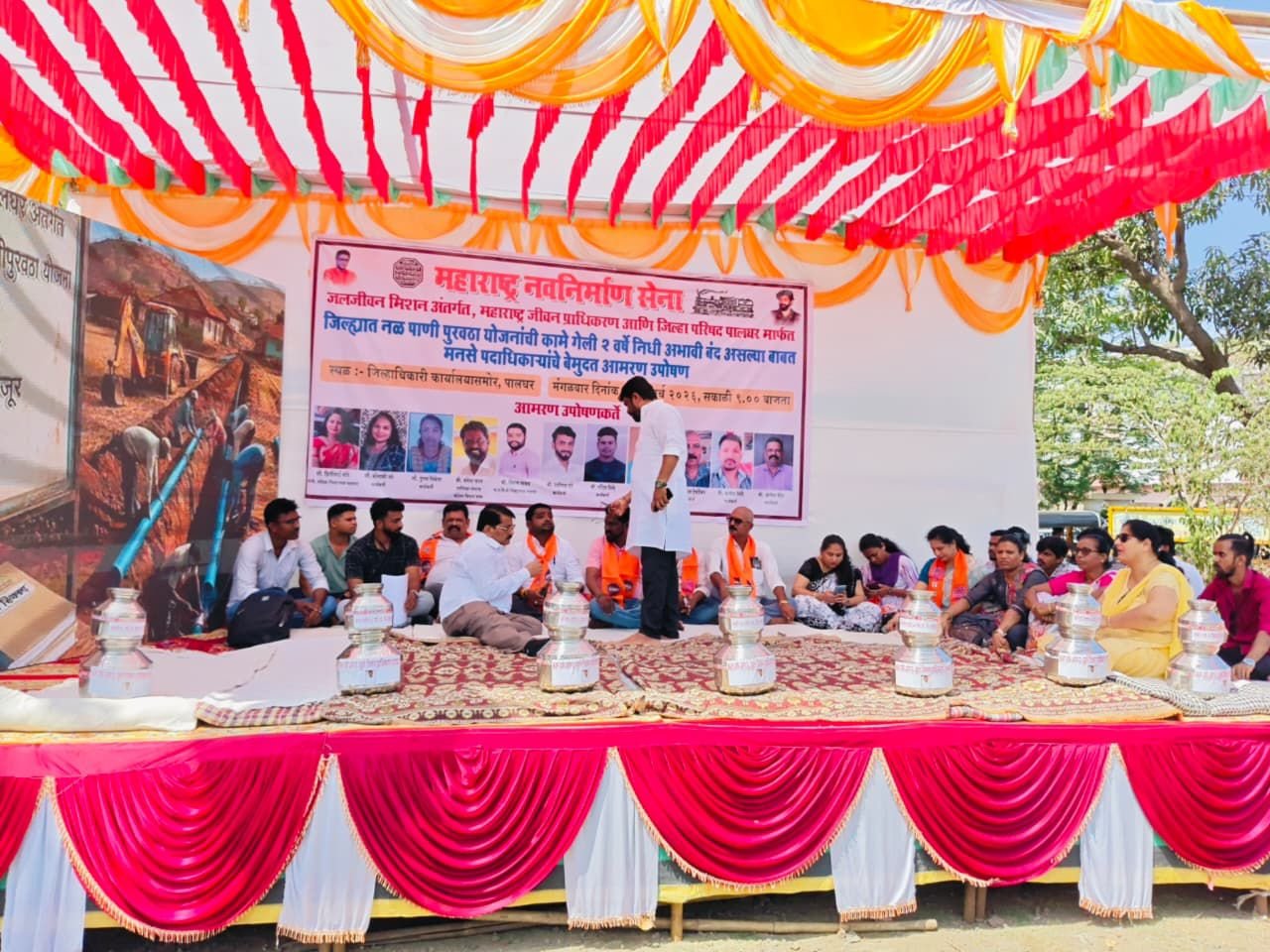 पालघर जिल्ह्यात जलजीवन मिशन अंतर्गत सुरू असलेल्या पाणीपुरवठा योजनांची कामे निधी अभावी अपूर्ण राहिल्याचा आरोप करत महाराष्ट्र नवनिर्माण सेनेचे (मनसे) पदाधिकारी जिल्हाधिकारी कार्यालयासमोर आमरण उपोषणास बसले आहेत. या आंदोलनामुळे जिल्ह्यातील पाणीप्रश्न पुन्हा एकदा ऐरणीवर आला असून प्रशासनावर तीव्र टीका होत आहे.मनसेच्या पदाधिकाऱ्यांनी दिलेल्या माहितीनुसार, महाराष्ट्र जीवन प्राधिकरण (MGP) मार्फत जलजीवन मिशन अंतर्गत विविध गावांमध्ये पाणीपुरवठा योजना सुरू करण्यात आल्या होत्या. मात्र, अनेक ठिकाणी कामे अर्धवट अवस्थेतच थांबली असून नागरिकांना अद्याप नियमित व स्वच्छ पाणीपुरवठा मिळत नसल्याची तक्रार आहे. निधी उपलब्ध नसल्याचे कारण देत कामे प्रलंबित ठेवण्यात आली असल्याचा आरोप आंदोलनकर्त्यांनी केला आहे.या पार्श्वभूमीवर मनसे पदाधिकाऱ्यांनी जिल्हाधिकारी कार्यालयासमोर आमरण उपोषण सुरू करत प्रशासनाकडे तातडीने निधी उपलब्ध करून कामे पूर्ण करण्याची मागणी केली आहे. “जलजीवन मिशन ही केंद्र व राज्य सरकारची महत्त्वाकांक्षी योजना असूनही प्रत्यक्षात ग्रामीण भागातील नागरिकांना त्याचा लाभ मिळत नाही. पिण्याच्या पाण्यासाठी महिलांना व नागरिकांना अजूनही वणवण भटकावे लागत आहे,” असे आंदोलनकर्त्यांनी सांगितले.उपोषणकर्त्यांनी इशारा दिला आहे की, जोपर्यंत प्रलंबित कामे पूर्ण करण्याबाबत ठोस निर्णय घेतला जात नाही, तोपर्यंत आंदोलन मागे घेण्यात येणार नाही. तसेच, प्रशासनाने याकडे दुर्लक्ष केल्यास जिल्हाभर तीव्र आंदोलन छेडण्यात येईल, असा इशाराही देण्यात आला आहे.दरम्यान, या आंदोलनामुळे जिल्हाधिकारी कार्यालय परिसरात काही काळ तणावपूर्ण वातावरण निर्माण झाले होते. आंदोलन कर्ते धिरज गावड यांनी कंत्राटदार घुले याच्या वर गंभीर आरोप केले असून त्याला प्रशासनाचा जावई म्हणून संबोधले आहे. तसेच गेल्या वर्षी माहीम येथे जे पाईप जळाले होते ते घुले यांनी स्वतः जाळले असल्याचा आरोप सुद्धा केला आहे. प्रशासनाकडून आंदोलनकर्त्यांशी चर्चा करून मार्ग काढण्याचे प्रयत्न सुरू असल्याची माहिती सूत्रांनी दिली आहे.जलजीवन मिशनच्या कामांबाबत नागरिकांमध्ये नाराजी वाढत असून, या आंदोलनातून पाणीप्रश्नाचा गंभीर चेहरा पुन्हा समोर आला आहे. आता प्रशासन या मागण्यांकडे कितपत गांभीर्याने पाहते आणि प्रलंबित कामे पूर्ण करण्यासाठी कोणती पावले उचलते, याकडे संपूर्ण जिल्ह्याचे लक्ष लागले आहे.